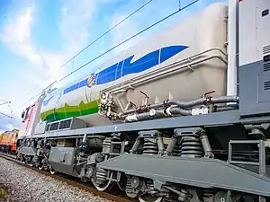 Однако сжиженный природный газ (СПГ) занимает вдвое больший объём, чем дизельное топливо той же массы, и требует для своего хранения специальную теплоизолированную криогенную ёмкость, которая должна превышать по объёму стандартные топливные баки более чем в два раза для хранения достаточного количества топлива на борту локомотива. Из-за большого объёма топливная ёмкость с СПГ не может быть размещена на той же секции магистрального локомотива, что и силовые агрегаты, и требует дополнительной тендерной секции[5]. Для возможности размещения на этой секции тяговых электродвигателей в целях более эффективного использования сцепной массы локомотива первичная силовая установка на другой секции должна обеспечивать высокую мощность, которой возможно добиться при использовании газовой турбины вместо газопоршневого или газодизельного двигателя. Кроме того, использование газового мотора, в особенности газовой турбины, позволяет добиться снижения количества вредных выбросов в атмосферу по сравнению с дизелем[3].