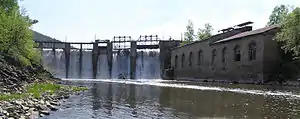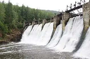 Плотина выполнена из бутового камня. Длина плотины — 125 м, максимальная высота — 21 м, ширина по гребню 4,2 м и по подошве 12,5 м. На плотине расположены поверхностные водосбросы (длина водосливной части — 71 м, общий пролёт водосливов — 57,5 м). Водосбросы оснащены затворами и механизмами их подъёма с ручным приводом. Между водосливной и глухой левобережной частями плотины размещён водоприёмник (напорная камера), откуда по металлическому водоводу длиной около 20 м и диаметром 2,5 м вода подаётся к зданию ГЭС[1][3].
