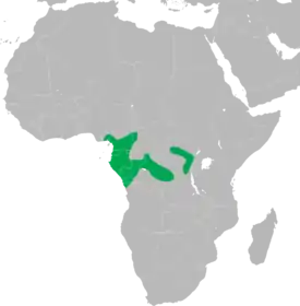 Распространён в экваториальном поясе западной и центральной части Африки. Известны два изолированных участка ареала. Более крупный из них охватывает площадь от южной Нигерии и южного Камеруна к югу до ангольской провинции Кабинда и низовьев реки Конго, к юго-востоку через среднюю часть Республики Конго до центральных и восточных районов Демократической Республики Конго (провинция Западный Касаи). Второй участок к востоку от первого занимает относительно небольшую площадь от долины реки Семлики на севере Демократической Республики Конго к юго-востоку до юго-западной Уганды, затем к югу до западных склонов гор Рувензори[3].