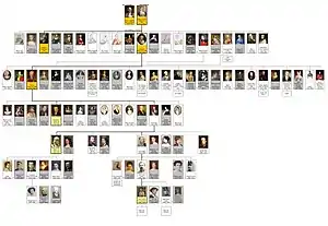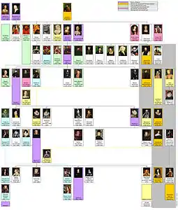 - Филипп II (король Испании) (исп. Felipe II de Habsburgo.; 21 мая 1527 — 13 сентября 1598) сочетался первым браком с Марией Португальской (дом Ависской династии), вторым браком с Марией I Тюдор (дом Тюдоров), третьим браком с Елизаветой Валуа (дом Валуа, ветвь династии Капетингов), четвёртым браком с Анной Австрийской, сестры Альбрехта VII Австрийскийского, эрцгерцога Австрийского, Штандгальтера Испанских Нидерландов, Вице-короля Португалии (Испано-Австрийской ветви дома Гасббургов).