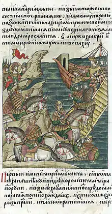 Дружинник Гаврила Алексич попытался въехать верхом на вражеский корабль по сходням, был, естественно, сброшен вниз, но не утонул (видимо, упал на мелком месте) и продолжал драться.