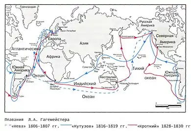 Простояв в Петропавловске с 10 июля по 3 октября, Гагемейстер 26 октября пришёл в Ново-Архангельск. Узнав здесь, что присутствие военного судна в Русской Америке не нужно, уже 3 ноября оставил Ново-Архангельск. Зайдя в Сан-Франциско, где из-за сильнейшей засухи не удалось запастись продовольствием и водой, Гагемейстер 13 декабря пошёл на юг почти по меридиану Сан-Франциско и, производя магнитные наблюдения совместно с немецким профессором-физиком Г. А. Эрманом, до этого производившим магнитные наблюдения на Камчатке, он убедился, что между 123°18' и 142° з. д. магнитный экватор не пересекает земного, а проходит на 1°48'-1°52' южнее.