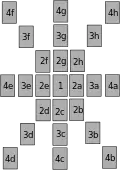 | Компас | Предназначен для гадания по вопросу «Что будет, если…» с несколькими альтернативами. | Карты выложены в форме n-лучевой звезды, где n — число рассматриваемых альтернатив. На иллюстрации показан полный вариант расклада, на 8 альтернатив. При выкладывании карт каждому лучу (четвёрка карт, от 1 до 4буква) ставится в соответствие один из предполагаемых вариантов действий. Карты выкладываются от 1, сначала все 2, по часовой стрелке, затем все 3, затем все 4. Карты на луче (1 — общее для всех начало) означают, в применении к соответствующей альтернативе: 1) Текущая ситуация. |
