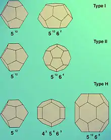 Полости, комбинируясь между собой, образуют сплошную структуру различных типов. По принятой классификации они называются КС, ТС, ГС — соответственно кубическая, тетрагональная и гексагональная структура. В природе наиболее часто встречаются гидраты типов КС-I (англ. sI), КС-II (англ. sII), в то время как остальные являются метастабильными.