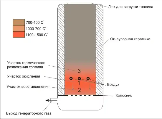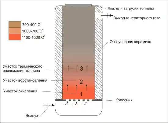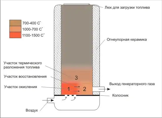 В газогенераторе протекает несколько основных химических реакций. При горении с обедненным количеством кислорода (пиролиз) протекают реакции окисления угля и углеводородов: