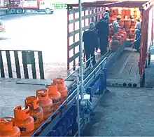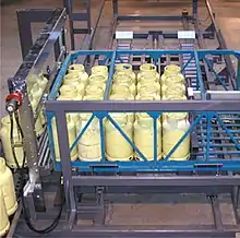 Линейная заправочная система с применением ручных или полуавтоматических заправочных постов рассчитана на пропускную способность 50-250 баллонов в час. Конвейерная с применением заправочных каруселей. Такие системы пригодны для заправки любых видов баллонов и могут строиться на базе как цепных, так и роликовых конвейеров.