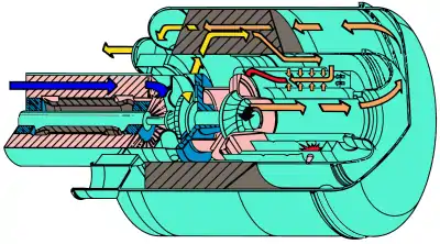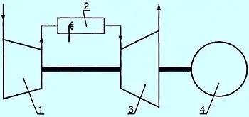 В компрессор (1) газотурбинного силового агрегата подаётся чистый воздух. Под высоким давлением воздух из компрессора направляется в камеру сгорания (2), куда подаётся и основное топливо — газ. Смесь воспламеняется. При сгорании газовоздушной смеси образуется энергия в виде потока раскалённых газов. Этот поток с высокой скоростью устремляется на рабочее колесо турбины (3) и вращает его. Вращательная кинетическая энергия через вал турбины приводит в действие компрессор и электрический генератор (4). С клемм электрогенератора произведённое электричество, обычно через трансформатор, направляется в электросеть, к потребителям энергии.