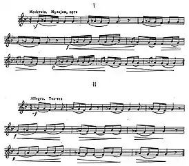 ![]() Ноты мелодий первой (с текстом хора танцоров) и второй частей танца[1] (в третьей части повторяются ноты второй, но в быстром темпе)[2] | |