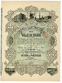 Компания, стоявшая у истоков электрификации столицы современного Татарстана, судя по дате, указанной на акции, основана в конце 1896 года с целью эксплуатации на концессионных началах введенной в строй годом раннее первой в городе электрической станции.[2]