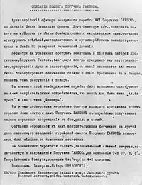 За то, что 12 сентября 1916 г, состоя артиллерийским офицером воздушного корабля «Илья Муромец № 16», следуя с кораблём в авангарде воздушной эскадры из 2 воздушных кораблей и 13 малых аппаратов, совершившей налёт на м. Боруны, прорвался сквозь заградительный артиллерийский огонь противника, вступил в ожесточённый бой с 4 германскими самолётами, принудил 3 из них снизиться и проникнул в тыл противника на 12 верст, достигнув Борун, погиб с кораблём от артиллерийского огня, дав возможность главным силам эскадры достигнуть цели и нанести неприятелю явный вред[9].