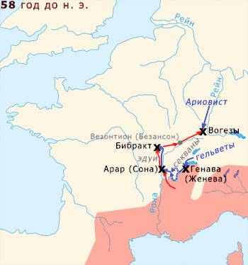 К началу проконсульства Цезаря римляне контролировали южную часть территории современной Франции, где была образована провинция Нарбонская Галлия. В конце марта 58 года до н. э. Гай прибыл в Генаву (современная Женева), где вступил в переговоры с вождями кельтского племени гельветов, начавшего переселяться из-за натиска германцев. Цезарю удалось не допустить гельветов на территорию Римской республики, а после того, как они вступили на земли союзного римлянам племени эдуев, Гай преследовал и разбил их. В том же году он разбил войска германского вождя Ариовиста, пытавшегося закрепиться на галльских землях левого берега Рейна[182].