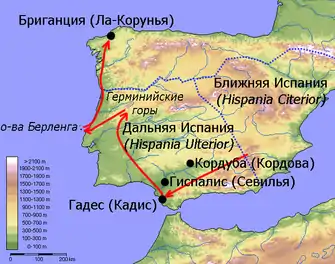 К моменту прибытия Цезаря в слаборазвитых северной и северо-восточной частях провинции было сильно недовольство римской властью и большими долгами. Цезарь немедленно набрал ополчение из местных жителей для подчинения недовольных регионов, что преподносилось как истребление бандитов[114][115]. По свидетельству Диона Кассия, благодаря военной кампании Цезарь надеялся своими победами сравняться с Помпеем, хотя установить прочный мир можно было и без военных действий[116]. Имея в распоряжении 30 когорт (около 12 тысяч солдат), он подошёл к Герминийским горам (современный хребет Серра-да-Эштрела) и потребовал от местных племён поселиться на равнинной территории, чтобы лишить их возможности использовать свои укрепления в горах в случае восстания. Дион Кассий полагает, что Цезарь с самого начала надеялся на отказ, поскольку рассчитывал использовать этот ответ в качестве мотива для нападения[116]. После того, как горные племена отказались подчиниться, войска наместника напали на них и вынудили отступить к Атлантическому океану, откуда горцы переплыли на острова Берленга. Цезарь приказал нескольким отрядам переправиться на острова на небольших плотах, но лузитаны перебили весь римский десант. После этой неудачи Гай вызвал флот из Гадеса и с его помощью переправил на острова крупные силы. Пока полководец покорял горных лузитанов на побережье Атлантического океана, соседи изгнанных племён начали подготовку к отражению возможного нападения наместника. Всё лето пропретор подчинял разрозненных лузитанов, взяв штурмом ряд поселений и выиграв одно достаточно крупное сражение[114][115][117]. Вскоре Цезарь покинул пределы провинции и направился в Бриганцию (современная Ла-Корунья), быстро захватив город с окрестностями[117][118]. В конце концов, войска объявили его императором, что в терминологии середины I века до н. э. означало признание победоносным полководцем[115]. Уже тогда Цезарь проявил себя решительным полководцем, способным оперативно перемещать свои войска[119].