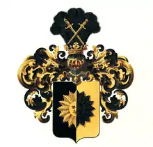 Над щитом дворянский шлем с короной. Нашлемник: пять чёрных страусовых перьев. На них накрест два золотых меча с золотыми рукоятками, обращённые остриями вниз. Намёт: чёрный с золотом.