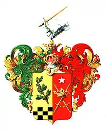 Щит увенчан дворянским коронованным шлемом. Нашлемник: правая согнутая рука в серебряных латах и перчатке держит золотой меч. Намёт справа зелёный с золотом, слева червлёный с золотом.