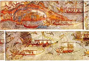Фреска из западного строения дворца показывает, вероятно, древнейшую из сохранившихся сцен морского боя. На ней минойцы одерживают победу над врагами, вероятно, ливийскими пиратами, осаждающими приморский город.
