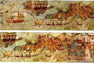 Фрески из Акротири содержат изображения множества судов различных размеров, но с примерно идентичной формой корпуса, напоминающей древнеегипетские корабли — те же высоко поднятые оконечности и низкий борт в средней части, хотя профиль их слегка асимметричен. Некоторые корабли приводятся в движение гребками, которые удерживают обеими руками свесившиеся за борт гребцы, другие имеют настоящие вёсла с уключинами, третьи — вообще не имеют ни вёсел, ни гребков, зато снабжены мачтой с прямым парусом, причём в деталях изображён даже такелаж.