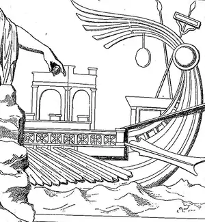 Чтобы нос корабля не слишком глубоко внедрялся в корпус противника и не застревал, на поздних античных галерах — уже намного более тяжёлых — применялся проэмболон — малый надводный таран, обычно имевший форму головы животного.