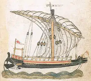 Парусное вооружение, как правило, состояло из двух мачт с латинскими парусами, но имелись галеры и с иным парусным вооружением и числом мачт[18]. Так например, бригантина несла на фок-мачте прямые паруса, а саета — имела три мачты, из которых фок-мачта опять же несла прямые паруса[19].