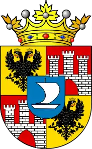 В расчетверённом щите накинут щиток, в голубом поле которого галера. В полях щита, золотых и красных накрест, в первом и четвёртом, по одному чёрному двуглавому орлу, а во втором и третьем каменные трёхбашенные ворота.