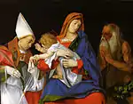 | Лоренцо Лотто | Мадонна с младенцем между святыми Игнатием Антиохским и Онуфрием | доска, масло | 53×67 | 1508 | ![]() |