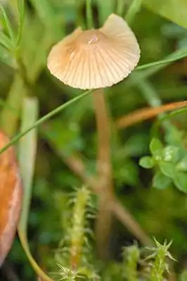 - Шляпка 0,6—3,5 см в диаметре, в молодом возрасте конической формы, затем раскрывающаяся до полушаровидной и выпуклой, гигрофанная, гладкая, по краю в молодом возрасте волокнистая. Окраска шляпки охристо-бурая, при высыхании выцветает до светло-жёлтой.