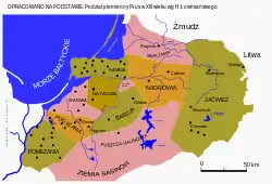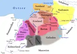 Тевтонский орден в 1231 году начал захват Галиндии с замка Кройцбург[4] (русское — Славское). Через труднодоступную местность крестоносцам приходилось по несколько раз захватывать одни и те поселения: в 1335 и 1396 годах Ангербург (Венгожево), 1285 и 1348 годах Лётцен (Гижицко), в 1345 году Йоханнисбург (Пиш) и в 1360 году Ортельсбург (Щитно). Согласно предположениям историков, часть галиндов переселилась в другие регионы, поэтому их земля была достаточно малозаселенной. Это способствовало переселению семей из Мазовии. Из остатков племени галиндов, немецких колонистов и мазовшан сформировалась народность мазуров[5], которые с XVI века перешли на лютеранство.