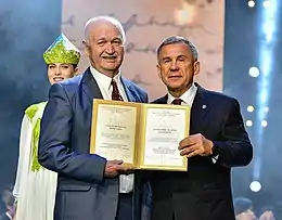 - Государственная премия Республики Татарстан имени Габдуллы Тукая (2019 год) — за роман-эссе «Мөхәммәт Мәһдиев йолдызлыгы» («Созвездие Мухаммета Магдеева»), книгу «Китек көзге» («Отколотое зеркало») и литературно-критическое издание «Мы — потомки страны „Тартария“»[45]. Вручена президентом Республики Татарстан Р. Н. Миннихановым на церемонии в выставочном комплексе «Казань Экспо»[46].