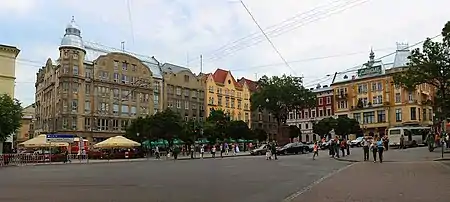 - Галицкая площадь, 7 — построено в 1902 году архитектором Каролем Боубликом; до 1934 года здесь находилась кофейня «Центральная», в которой собирались в начале ХХ столетия поэты «Молодой музы».
