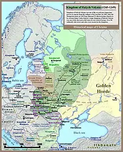 Во время монгольского нашествия в 1240 году пал Киев[35], в начале 1241 года монголы вторглись в Галицию и Волынь, где разграбили и сожгли Галич, Владимир и «инии грады мнози, им же несть числа». По мнению некоторых историков, татары к тому времени были ослаблены военной кампанией на территории восточной Руси[36], в результате чего некоторые города Галицкой (западной) Руси сумели отбиться от татар, как, например, Холм, Кременец и Данилов[37]. Воспользовавшись отъездом князей в Венгрию и Польшу, боярская верхушка, поддержанная галицким епископом Артемием, подняла мятеж. Слабостью княжества воспользовались его соседи, которые поддержали претензии сына Михаила черниговского на Галич. В 1244 году Романовичи захватили польский Люблин, воспользовавшись польской междоусобицей, а в 1245 году разбили венгров, поляков и взбунтовавшихся бояр в битве под Ярославом. Боярская оппозиция была окончательно уничтожена, и Даниил смог централизовать управление княжеством.