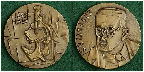 Памятная медаль к 125-летию со дня рождения Николая Федоровича Гамалеи, изготовленная на Ленинградском монетном дворе в 1987 году. Медальер Марианна Романовская. Бронза, диаметр 60 мм.