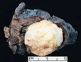 ![]() Гамартома лёгкого, удалённая вместе с участком лёгочной ткани. Гамартома легко отделяется от окружающей лёгочной паренхимы. | |