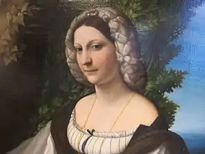 Неизвестная дама в траурном (монашеском) наряде изображена под сенью лавра, который символизирует её поэтическое дарование. Ствол дерева, обвитый плющом, обозначает вечную любовь и супружескую верность. По одной из версий, на портрете представлена Джиневра Рангоне, супруга Джангалеаццо да Корреджо. По другому распространённому предположению — это и есть Вероника Гамбара.