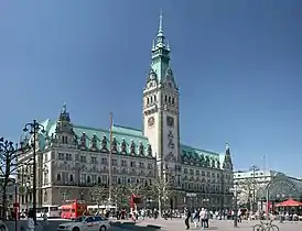 Несмотря на разрушения 1940-х гг., город сохранил отдельные черты средневековой застройки. Центр города, расположенный при впадении реки Альстер в Эльбу, делится на районы Альтштадт («Старый город») и Нёйштадт («Новый город»)[25]. Среди главных достопримечательностей: неоренессансная Ратуша (1886—1887) на Ратушной площади, в которой располагается городская мэрия и сенат; дома XVII—XVIII веков на улицах Раймерствите, Кремон, Дайхштрассе (в том числе Свечной гильдии, 1676); выполненные в стиле кирпичной готики церкви Св. Екатерины (рубеж XIV и XV вв.) с барочной башней, Св. Петра (1310-е гг.), Св. Якова (рубеж XIV и XV вв.); барочная церковь Святого Михаила (XVIII век) со 132-метровой башней, неоготическая церковь Святого Николая (в руинах) со 150-метровой башней, памятник Бисмарку на Хельголандер-Аллее (1906), модернистские дома «Чилихаус» и «Шпринкенхоф», оперный театр. В Гамбурге проводится Российско-немецкий кинофорум.