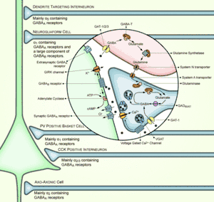 γ-Аминомасляная кислота выполняет в организме функцию ингибирующего медиатора центральной нервной системы. При выбросе ГАМК в синаптическую щель происходит активация ионных каналов ГАМКA- и ГАМКC-рецепторов, приводящая к ингибированию нервного импульса. Лиганды рецепторов ГАМК рассматриваются как потенциальные средства для лечения различных расстройств психики и центральной нервной системы, к которым относятся болезни Паркинсона и Альцгеймера, расстройства сна (бессонница, нарколепсия), эпилепсия.