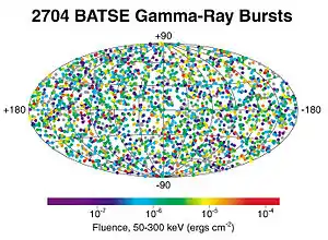 С помощью BATSE были подтверждены результаты ФТИ о том, что ГВ распределены по небесной сфере изотропно, а не группируются в какой-либо области пространства, например, в центре галактики или вдоль плоскости галактического экватора[21]. Из-за плоской формы Млечного пути источники, принадлежащие нашей галактике, концентрируются у галактической плоскости. Отсутствие такого свойства у ГВ является сильным доказательством их происхождения извне Млечного пути[22][23][24], хотя некоторые модели Млечного пути всё ещё согласуются с подобным изотропным распределением[25].