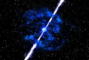 Это сравнительно узкий луч мощного излучения, поэтому ГВ возможно в наблюдаемый в отдалённых галактиках и до сих пор только слабые 2 были замечены в нашей.[6] Энергия ГВ не бывает сферически равномерно распределена. Джеты сосредоточенны подобно космической пушке, конусообразно из полюсов пульсара.