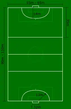 Игра проходит на травяном поле размером длиной 90-110 м, шириной 55-65 м. Поле пересекает две параллельные линии за 35 м от линии ворот, которые разделяют поле на 3 секции; В каждой секции может быть до 6 игроков каждой команды. Ворота - шириной 7,32 м и высотой 2,44 м. Пенальти бьют с расстояния 14 метров.