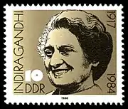 Инди́ра Приядарши́ни Га́нди (хинди इन्दिरा प्रियदर्शिनी गान्धी[6]; 19 ноября 1917 — 31 октября 1984) — индийский политик, центральная фигура в партии «Индийский национальный конгресс», единственная женщина — премьер-министр Индии. Дочь первого премьер-министра страны Джавахарлала Неру (1889—1964), Неру занимал пост премьер-министра со дня обретения независимости от Британии (Индия — бывшая британская колония) с 15 августа 1947 до гибели в 1964 г.