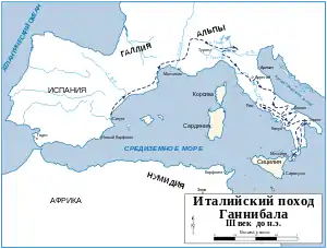 Ганнибал несколько дней продвигался вверх по течению Роны, дойдя до её слияния с Изером[82], а затем повернул на восток. Он шёл вдоль Изера до её слияния с Арком[83], где начиналась гористая альпийская местность. В боях с горцами Ганнибал переходил Альпы[84][85]. На девятый день с начала подъёма, в конце октября[83], Ганнибал стоял на вершине перевала[86][87]. Спуск продолжался около 6 дней, и наконец, Ганнибал спустился в верхнюю долину Мориены[88]. У него осталось 20 тысяч пехотинцев и 6 тысяч всадников[89].
