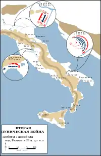 После битвы при Каннах Ганнибал двинулся к Неаполю, но не решился его штурмовать и направился к Капуе[139]. Капуя, в которой возобладали антиримские настроения, перешла на сторону Ганнибала. Оставив в Капуе гарнизон, карфагенский полководец захватил Нуцерию[140] и попытался взять Нолу, но Марцелл отстоял город и нанёс Ганнибалу поражение[141]. Затем карфагеняне безуспешно попытались склонить Ацерры к сдаче, но когда их жители отказались, они разграбили и сожгли город[142]. После неудачной попытки взять Казилин Ганнибал ушёл на зимние квартиры в Капую[143].
