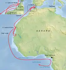 Точная дата путешествия Ганнона неизвестна. Это произошло, по одним сведениям, в 525 до н. э., по другим — в 470 до н. э. По решению Совета десяти — высшего органа управления Карфагена — его уполномочили возглавить экспедицию, которая должна была исследовать западные берега Африки и основать там новые карфагенские колонии. Ганнон пустился в плавание на 60 пентеконтерах с 30 000 спутниками обоего пола[1].