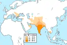 У цыган составляет около 60 %[5], что говорит в пользу гипотезы об их индийском происхождении[6]. Часто встречается в Индии (27 %)[7]. Видимо, она сохранилась от палеолитического местного населения, поскольку в некоторых поселениях достигает 35 %, но в высших кастах встречается реже (около 10 %)[8]. Также данная гаплогруппа встречается у калашей (20,5 %)[9], таджиков из Душанбе (12,5 %), курдов из Туркмении (6 %), сирийцев (5 %)[10].