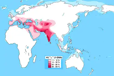 • Высокие концентрации L также отмечаются в Южной Индии (17-19 % от региона в целом),[15] у пуштунов северного Афганистана (25 %)[16] и в Пакистане (11,6 % в целом[13], 28 % на западе страны, включая Белуджистан[1]). Встречается в Таджикистане, Узбекистане, Турции, а также более низкими частотами в Иране и на всём Ближнем Востоке. В течение тысячелетий этот мужской ген присутствовал очень низкими частотами на Кавказе и в Европе.