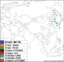 16. 150/628 = 23,9 % O2b1-47z in a pool of all non-Ainu and non-Okinawan Japanese samples of Jin et al. (2003), Hammer et al. (2006), Xue et al. (2006), and Nonaka et al. (2007)