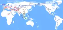 2. Движение гаплогруппы P происходило по другую сторону Тибетского нагорья — вдоль Сычуаньских Альп и — уже из района Ганьсу и Нинся́ — вдоль Шёлкового пути на запад и в сторону Чукотки на север-восток. Климат в ту эпоху значительно отличался от современного, так что в Таримской низменности, Монголии и Маньчжурии была более обильная флора и фауна, что позволяло этим землям быть достаточно густонаселёнными. Уровень моря был до 112 метров ниже 18 тыс.л.н., и почти столь же низким на протяжении последних 100 тысячелетий, что способствовало быстрому прибрежному расселению гаплогруппы K и K(xLT) по Восточной Азии, через степи севернее Пекина на запад к Таримской впадине и на восток в Маньчжурию. Эта версия подкрепляется фактами обнаружения P* в Южной, Юго-Восточной и Восточной Азии (а также в Океании), а также тем, что в прилегающих районах распространены и сестринская для P группа NO1 (K2a) и дочерние M (K2b1b) и S (K2b1a).