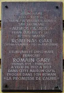 - В 1999 году в Вильнюсе на доме по улице Басанавичяус, 18 (бывшая Большая Погулянка), в котором жил писатель с матерью, была открыта мемориальная доска с текстом на литовском и французском языках. В настоящее время (ноябрь 2018 года) табличка отсутствует (по всей видимости, украдена).