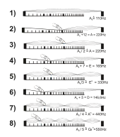 Например, если щипнуть гитарную струну, то она, вибрируя по всей своей длине, максимально перегибается посередине, что порождает динамический момент жёсткости и более высокочастотное (ровно в два раза, за счёт той же энергии щипка) колебание обеих половинок струны (то есть, две дополнительные гармоники) — и т. д.[1] При этом порождаемые призвуки более тихие, так как помимо частоты колебаний существует ещё и понятие их размаха, амплитуды — громкость.[прояснить]