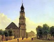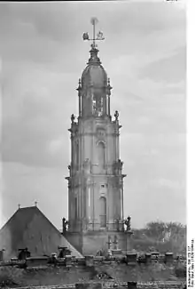 Болотистые почвы под зданием вызвали появление трещин, и в 1730 году церковь начали разбирать, демонтировав в первую очередь карильон. Новое здание проектировалось под патронажем короля Пруссии Фридриха Вильгельма I, требованием которого было строительство импозантной колокольни по образцу Парохиальной церкви в Берлине (нем. Parochialkirche_(Berlin)), построенной в 1695—1715 годах в Берлине.[2]