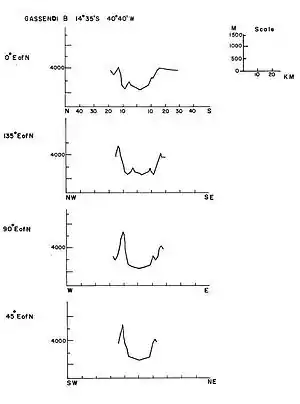 На приведенном графике представлено сечение кратера в различных направлениях[7], масштаб по оси ординат указан в футах, масштаб в метрах указан в верхней правой части иллюстрации.
