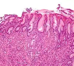 Гастри́т (лат. gastritis, от др.-греч. γαστήρ [gaster] «желудок» + суффикс -itis «воспаление») — воспалительные или воспалительно-дистрофические изменения слизистой оболочки желудка; длительно протекающее заболевание, характеризуется дистрофически-воспалительными изменениями, протекает с нарушением регенерации, а также с атрофией эпителиальных клеток и замещением нормальных желёз на фиброзную ткань.